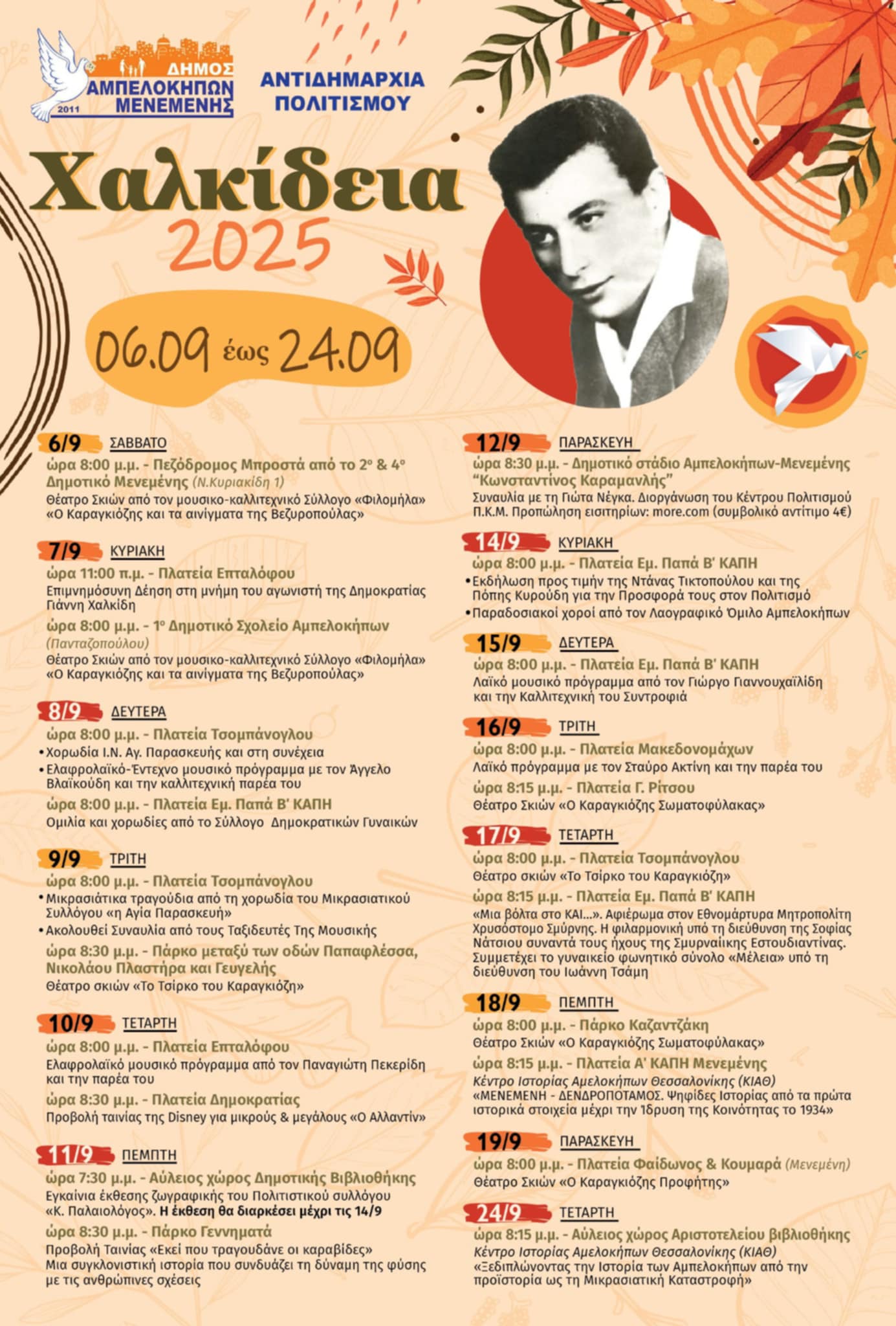 Την Κυριακή 7 Σεπτεμβρίου, στις 11.00 π.μ., στην Πλατεία Επταλόφου, θα τελεστεί επιμνημόσυνη δέηση στη μνήμη του αγωνιστή της Δημοκρατίας, του Γιάννη Χαλκίδη. Μια σεμνή τελετή τιμής για έναν άνθρωπο-σύμβολο της ελευθερίας. Το ίδιο βράδυ, στις 20.00, στο 1ο Δημοτικό Σχολείο Αμπελοκήπων, επί της οδού Πανταζοπούλου, θα παρουσιαστεί από τον μουσικο-καλλιτεχνικό Σύλλογο «Φιλομήλα» η παράσταση Θεάτρου Σκιών «Ο Καραγκιόζης και τα μηνύματα της Βεζυροπούλας». Μια διασκεδαστική ιστορία με κοινωνικά μηνύματα, για μικρούς και μεγάλους.