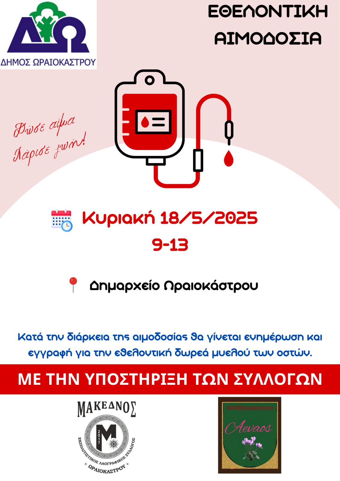 Η αιμοδοσία θα πραγματοποιηθεί την Κυριακή, 18 Μαΐου 2025, από τις 9 το πρωί ως τη 1 το μεσημέρι στο Δημαρχείο Ωραιοκάστρου.