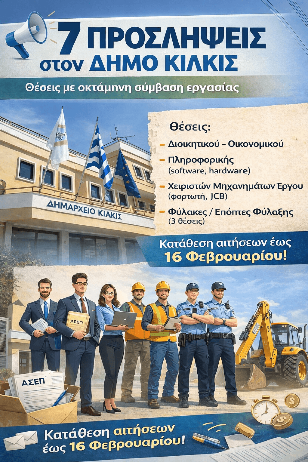Την πλήρωση επτά (7) θέσεων διαφόρων ειδικοτήτων με σύμβαση εργασίας οκτώ μηνών για την κάλυψη εποχικών αναγκών στις υπηρεσίες του ανακοινώνει ο Δήμος Κιλκίς.