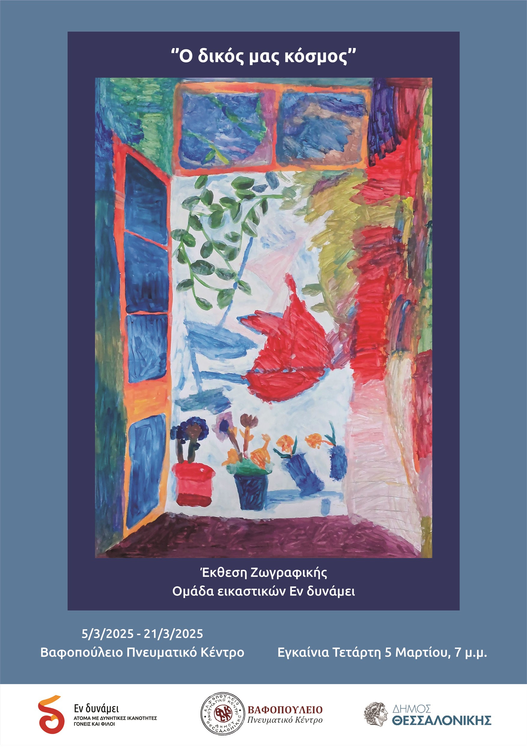 Το Βαφοπούλειο Πνευματικό Κέντρο σε συνεργασία με την ομάδα εικαστικών Εν δυνάμει θα φιλοξενήσει έκθεση ζωγραφικής με τίτλο «Ο δικός μας κόσμος», από την Τετάρτη 5 έως και την Παρασκευή 21 Μαρτίου 2025.