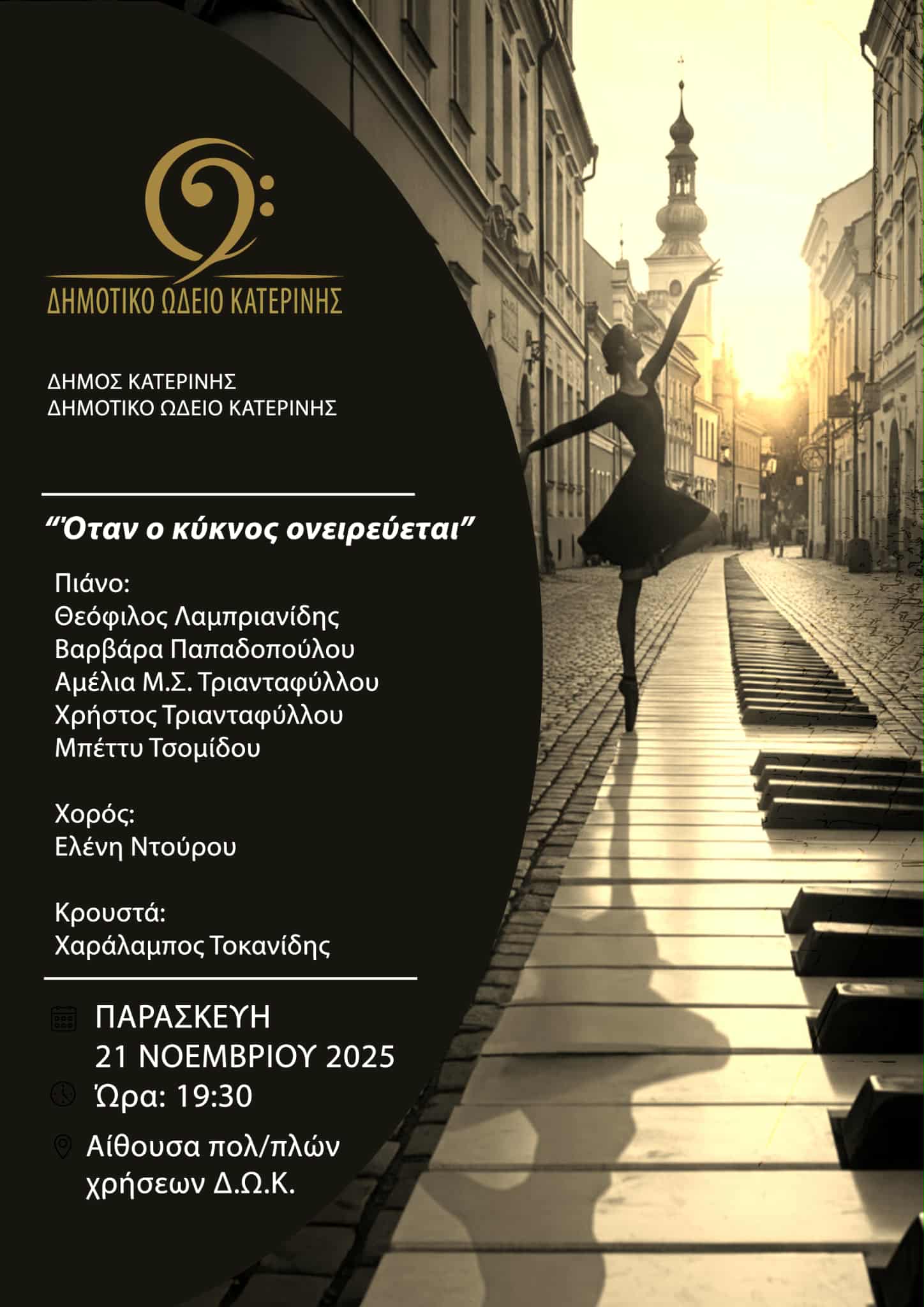 Tη μουσικοχορευτική βραδιά «Όταν ο κύκνος ονειρεύεται», παρουσιάζει το Δημοτικό Ωδείο Κατερίνης, μια συνάντηση ήχων και κινήσεων, όπου το πιάνο, ο χορός και τα κρουστά συνυπάρχουν σε κοινό σκηνικό χώρο για να αφηγηθούν, μέσα από τη γλώσσα της τέχνης, την ονειρική μεταμόρφωση του ήχου σε εικόνα και ρυθμό.