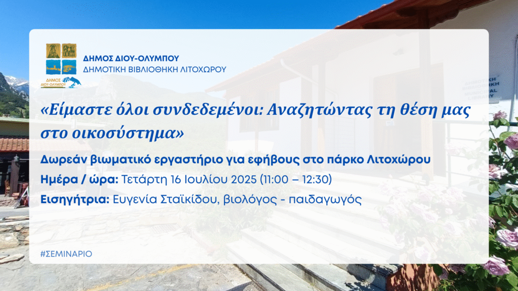 Η Δημοτική Βιβλιοθήκη Λιτοχώρου διοργανώνει δωρεάν βιωματικό εργαστήριο για εφήβους, με θέμα «Είμαστε όλοι συνδεδεμένοι: Αναζητώντας τη θέση μας στο οικοσύστημα» θα πραγματοποιηθεί την Τετάρτη 16 Ιουλίου 2025 (ώρες 11:00 – 12:30).